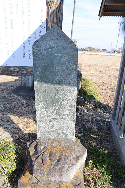 高さ98㎝、幅36㎝を測り、葛西用水南岸の畑より出土したものです。虚空菩薩以下13仏を種子で刻み、その上に天蓋と日月が描かれています。下部に文明13(1481)年の銘があり、また「一緒結中」の文字が判読できることからがわかります。
