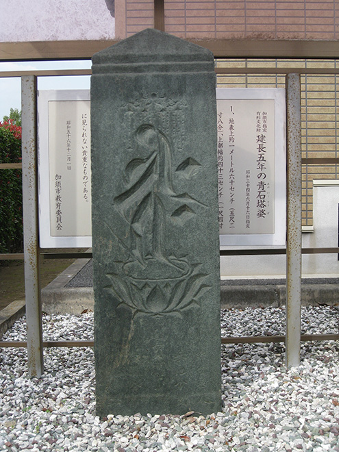 地上高158㎝、幅47㎝を測ります。本尊は天蓋と連座をともなう阿弥陀種子(キリーク)で深く薬研彫りされた姿は初期の青石塔婆にみられる力強い印象を与えます。かつて種子の部分は塗金が施されています。往生要集の一部を偈文としています。