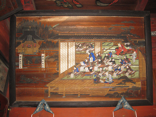 構図は左に「奉納薬師如来」の幡を建てた本堂を描き、画面右に大きく江戸時代の庶民を対象とした教育施設である寺子屋に使った庫裏で寺子達が手習いをしているようすがよく描かれています。