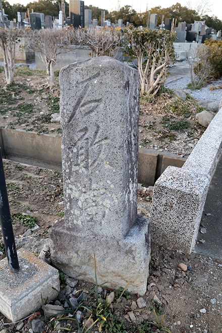 右側面に「 石橋施主回心(いしばしせしゅかいしん)」と刻んであり、僧侶が石橋を渡って入ってくる魔物をよけるために立てたものと思われます。