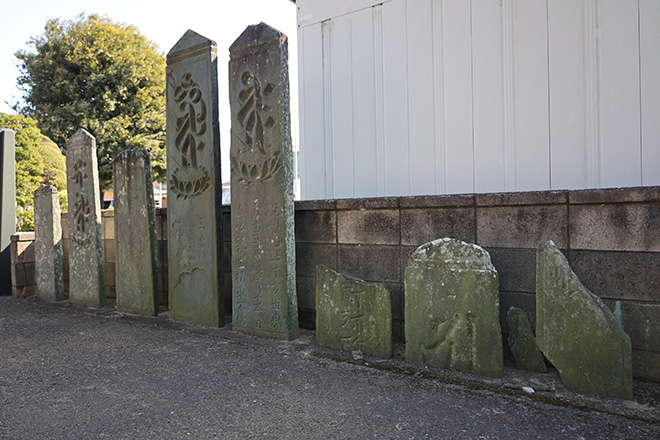 阿弥陀如来(あみだにょらい)が極楽浄土に迎えにくる様子を描いた画像(がぞう)板碑のほか、釈迦(しゃか)と阿弥陀(あみだ)の2尊を主尊とする板碑など8基があり、鎌倉期の貴重な板碑です。