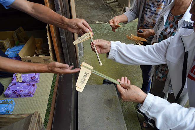 各家が前の年に神社から頂いた鎌(経木(きょうぎ))を持ち寄って新しい鎌と取り替え、作物の豊作を祈願する祭りです。