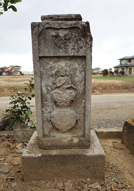 三眼六臂(一部欠失)の愛染明王塔で、日輪の円光を背負い獅子冠を戴き、宝瓶上の蓮華座に結跏趺坐します。金鈴・五鈷杵・弓矢・拳・蓮華を持ち、銘に「造立者為妙色増長民屋豊饒」「寛政5(1793)年11月吉日願主当村中」とあります。二十六夜待供養のための造立で、笠付の痕跡も残ります。独尊の愛染明王塔は分布が限られ希少で、小野袋の講の存在を伝える重要資料です。