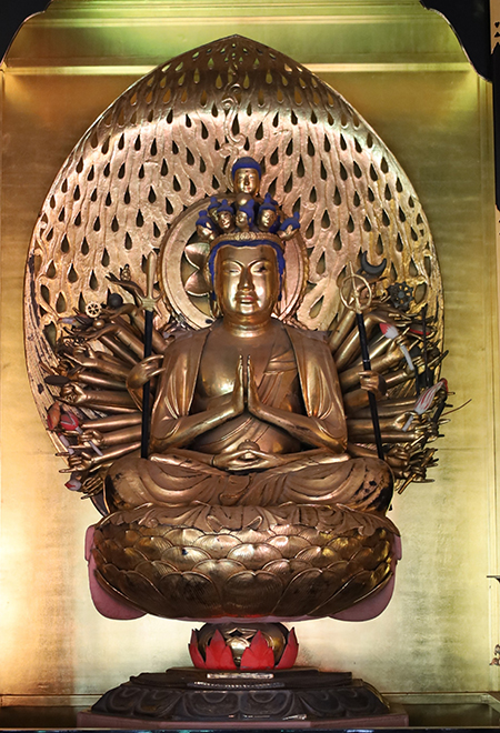 円満寺本堂の厨子(ずし)に収められた木造の千手観音坐像です。 合掌手(がっしょうて)、持蓮華手(ぢれんかて)、脇手(わきて)合わせて42本、頭上面は頂上面も含め11面あり、千手観音像の代表的な形となっています。