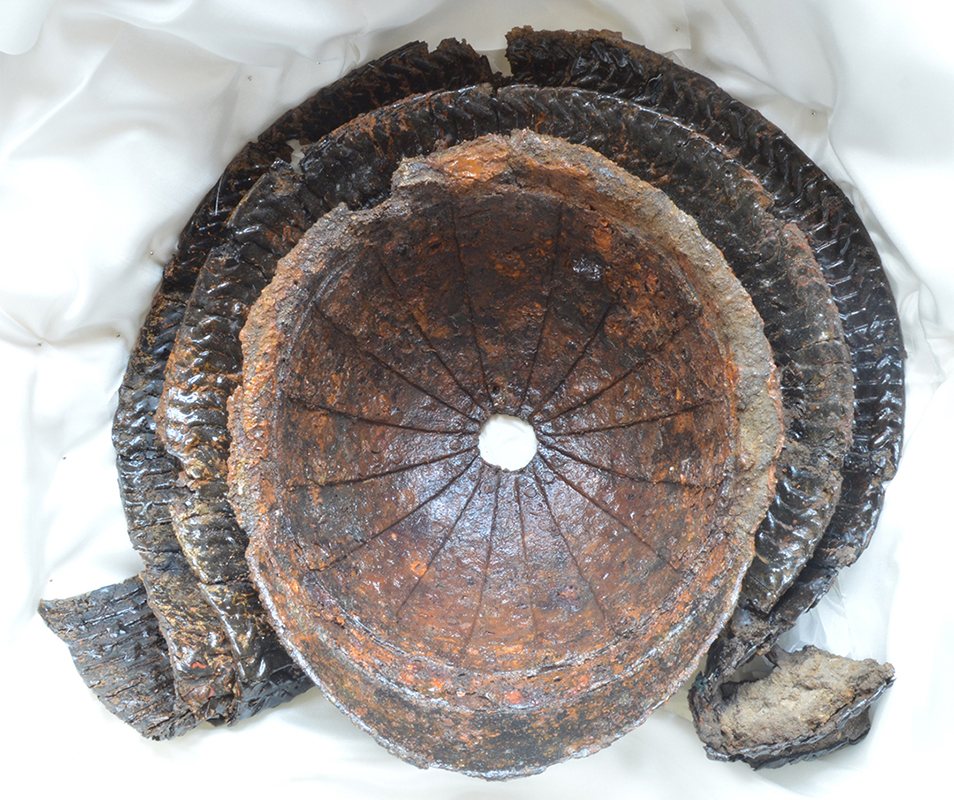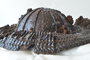 吹返し・シコロが本来よりやや上に位置するのは、兜が埋まった後、重い鉢だけが沈み、吹返し・シコロが上に残ったせいでしょう。